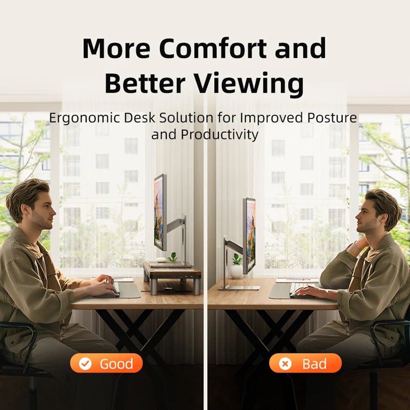 The CABLETIME 9-Port USB-C Docking Monitor Stand offers an ergonomic desk solution that promotes better posture and boosts productivity. It features a small storage drawer for convenient organization, a secure anti-slip design for stability, and durable aluminum legs with a stylish wood grain finish. The integrated wireless charging pad keeps your devices powered, combining comfort and functionality in one sleek stand.