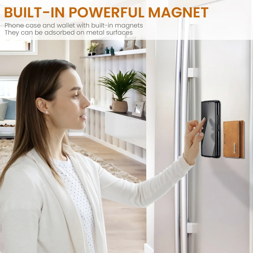 The Samsung Galaxy Z Fold7 Magnetic Leather Wallet Case combines a large-capacity wallet and slim protective case in one versatile design. Thanks to powerful magnets, the wallet and case can be easily disassembled or combined to suit your needs. The built-in kickstand adds hands-free convenience, making it perfect for watching videos or video calls while keeping your essentials organized and your device protected.
