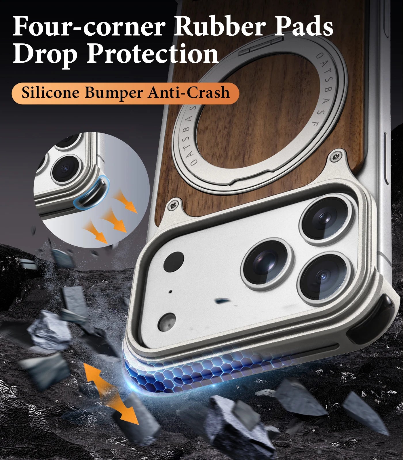 Shockproof Wooden MagSafe Case with 360° Kickstand Ring for iPhone 17 Pro & Pro Max